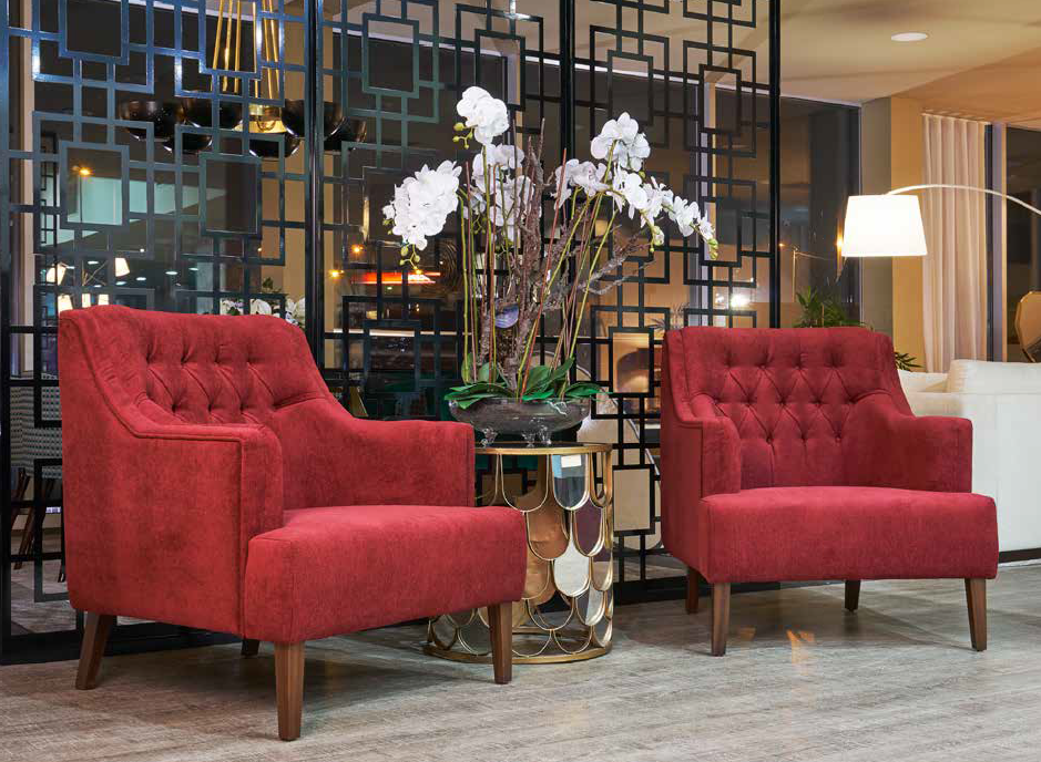 Viva Magenta pairs well with warm or cool tones making it the perfect accent to any space. In our design, we start with a neutral shade of our Quietlok Plus Flooring – Summer Oak Leche. Our ERT flooring provides a neutral base to our design and has many incredible characteristics. Accentuate this magenta focus with our Mpressions Area Rugs. We’ve included two options: subtle RED-33201 or dramatic RED-3. Either way, we guarantee your guests will stop and stare. Viva Magenta makes a stunning fabric for accent furniture, as shown in the pair of matching chairs. Design a custom Ultracera color for a unique finish! Any design you dream of, we can create! Here, we modified Vincent Ginger by adding swirls of Viva Magenta. Who doesn’t want a custom countertop? It would be a beautiful way to complete a mini-bar or desk! Contact your local sales rep to get started on your dream design.