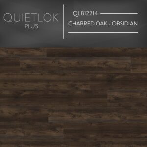 The base of our design is our popular QuietLok® Plus Flooring in a dark and detailed option – Charred Oak Obsidian. QuietLok® Plus is a multi-layer floating floor available in over 15 color options. It offers a robust 22-mil wear layer, realistic in-register embossing, a 4mm thick extruded vinyl core layer, and features our QuietCore® and ClikLok® technologies for sound reduction and easy installation. It is most suitable for high-traffic areas such as public areas or hallways.